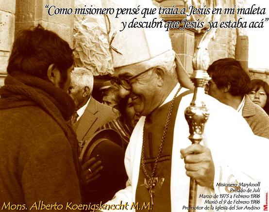 Desde muy lejos llego a Juli un Misionero y llego para quedarse para siempre, Monseñor Alberto Koenigsknetcht, Misionero Maricknoll nació el 30 de mayo de 1917 en Fowler, Michigan EE.UU.,fue ordenado Sacerdote el 10 de junio de 1945, Nombrado prelado de Juli el 31 de marzo de 1974 y murio en un accidente cumpliendo su labor pastoral en Qaritamaya (lugar de descanso) Puno un 9 de febrero de 1986, sus restos reposan en la Catedral de Juli.