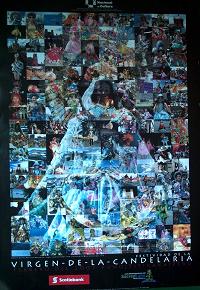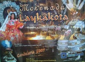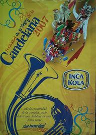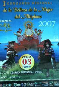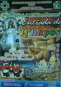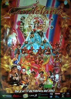LOS AFICHES EN LA FIESTA DE LA VIRGEN DE LA CANDELARIA. En la Fiesta de la Virgen de la Candelaria, anteriormente la institucion que organizaba los concursos de danzas, era la que promovia con un afiche festivo, cuyas imagenes tenian relacion con la fiesta, pero en estos ultimos años, no solo esta institucion es la que reparte tales afiche, lo hacen tambien la Region Puno, el Municipio Provincial de Puno, las Empresas Privadas, las repartidoras de de bebidas, e incluso los propios conjuntos, estos afiches con los adelantos de la fotografia, denotan mucha expresion y color, e incluso muchos artistas participan de concursos para la rerpresentacion del afiche festivo, es asi que va avanzando mas el arte y expresion con motivos de nuestra fiesta patronal.