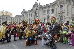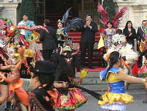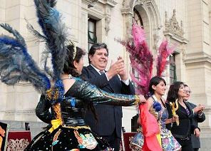 ceremonia en Palacio de Gobierno los congresistas por la región Puno Aldo Estrada, Alfredo Cenzano, Yonhy Lescano, Margarita Sucari y Susana Vilca, y con ellos, el alcalde provincial de Puno, Luis Butrón Castillo; y la presidenta de la Federación Regional de Folclor y Cultura de Puno, Yenny Silva Quispe. En esta ceremonia, los sicuris, de la asociación educativa y cultural de Rurarccaya, abren la parte artística de la presentación. El sicuri es un símbolo de la identidad de Puno, llamada también la “Nación Altiplánica”. En seguida, la morenada, de la asociación central folclórica de Puno; la saya, la wifala, y la diablada, ganadora del último concurso de danzas de trajes de luces de la festividad de 2010. Puno, la Capital del Folclor Peruano, celebra cada año la más grande fiesta patronal del país. Las calles, adornadas con guirnaldas y luces, se convierten en el espacio perfecto para el desfile de 40,000 danzarines y 9,000 músicos de todo el departamento, durante los 17 días que duran los festejos. (FIN) NDP/RES - GRM LANZAMIENTO DE LA FESTIVIDAD VIRGEN DE LA CANDELARIA 2010.