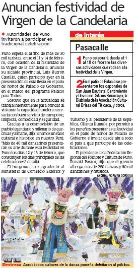 en octubre pasado. “Ellos desfilarán por las céntricas calles de la ciudad luciendo imponentes trajes”, comentó. Las novenas en honor a la Virgen de la Candelaria se iniciarán la última semana de enero en el templo San Juan, santuario de la patrona de Puno, señaló.Silva Quispe ofreció estas declaraciones tras participar en la ceremonia del lanzamiento de la Festividad de la Virgen de la Candelaria 2011 en el Patio de Honor de Palacio de Gobierno a ritmo de danzas folclóricas de Puno. El lanzamiento estuvo a cargo del congresista puneño Aldo Estrada Choque, quien señaló que la festividad “es un verdadero certamen, en el cual la danza, la música y todo cuanto tiene que ver con la alegría y fastuosidad sale a relucir en este importante evento que es admirado por propios y extraños”. También participaron los legisladores puneños Yohny Lescano, Margarita Sucari y Susana Vilca, así como el alcalde de Puno, Luis Butrón Castillo, quienes al término de la ceremonia danzaron junto a las agrupaciones folclóricas. Se presentaron bailes típicos como la morenada, la diablada y los caporales. La Virgen de la Candelaria es la patrona de la ciudad de Puno, ubicada a 3,870 metros sobre el nivel del mar. Sus calles, adornadas con guirnaldas y luces, se convertirán como cada año en en el espacio perfecto para el desfile de 40,000 danzarines y 9,000 músicos de todo el departamento. (FIN) LTO/JO Lanzan festividad de la Virgen de la Candelaria 2011 en Palacio de Gobierno