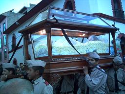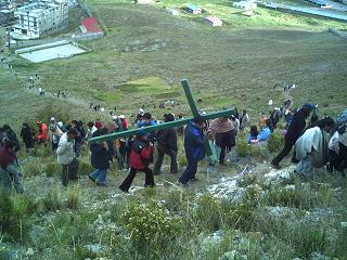 UN VIERNES SANTO EN PUNO. Puno, muestra su profunda Fe y devoción no solo a María de la Candelaria el 2 de Febrero, si no también lo demuestra a nuestro Señor Jesucristo, en los diversos ritos y costumbres en el Viernes Santo, por ejemplo en el hogar se hacen oraciones ofreciendo incienso en el bracero, para luego a medio día almorzar algunos platos en especial, ya aun siendo de noche los pobladores suben o bien al Cerro Azoguini acompañando al Señor de la Caida o también se sube al Cerro Huayna Pucara en el Vía Crucis, en cada una de las estaciones se deposita una piedra en señal que estamos pasando por allí, dejando nuestros pecados y sufrimientos, esta peregrinación va acompañada de ritos en el "Calvario" donde se pide perdón, una vez en la punta del cerro, luego de terminar con las oraciones, se empieza a construir la casa utilizando piedras, paja, flores que se encuentran en la sima de tales lugares implorando al Señor Jesús, a fin de que pueda hacer realidad nuestros sueños, conceder buena salud y buena cosecha; luego allí mismo o ya una vez en la ciudad se adquiera las diversas yerbas para curarse de los males que nos aquejan tales como: la hierba buena, manzanilla, hinojo, salvia, hierba luisa, ideondilla o hierba santa, muña, valeriana, zarza parilla, y muchos mas; a lo igual que el domingo de ramos, se recogen cactus que puestos en la puerta protegen de malos espíritus, también es costumbre matar culebras en el cerro o campos por que se dicen pertenecen al diablo. Ya en la tarde se participa de la adoración a la Cruz, en las diversas parroquias de la ciudad, para luego acompañar a la imagen del Cristo Yaciente, procesión donde autoridades y pueblo en general irrumpen por las principales calles de Puno, siendo participes los niños, quienes cargan la Corona de Espinas del Señor, y las damas acompañan a la Virgen Dolorosa, imágenes que ya entrada la noche retornan a la Catedral de Puno. |