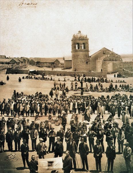 Acora, 1919. Foto de autor desconocido. Se trata de una reunión de apoyo a Leguía, con la población claramente dividida entre los notables del pueblo y los campesinos aymaras. Archivo de Billy Hare. |