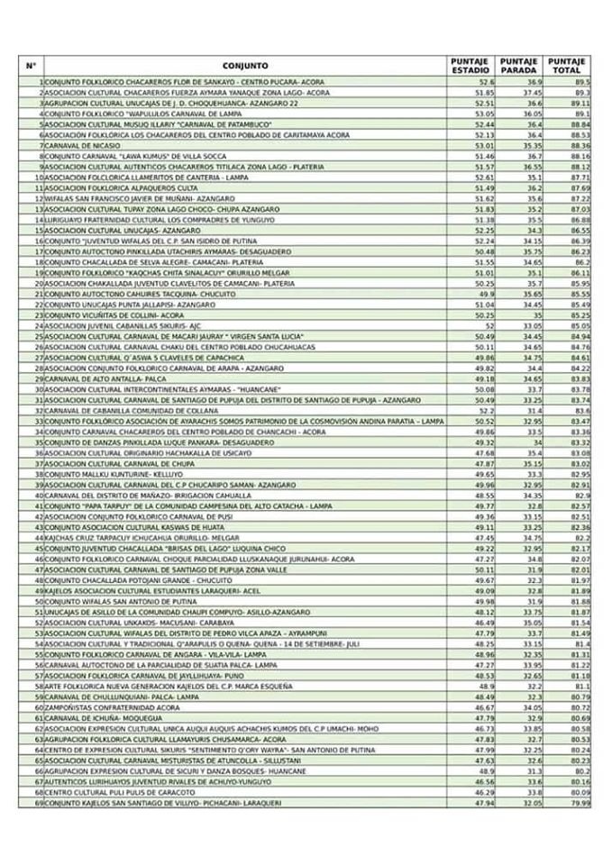 PUNTAJE FINAL CONCURSO REGIONAL DE DANZAS AUTOCTONAS CANDELARIA 2020