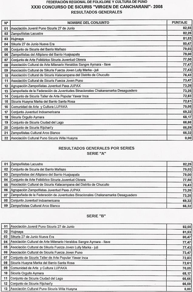 XXXIII CONCURSO DE SICURIS Y ZAMPOÑAS, VIRGEN DE CANCHARANI 2010. 01.- Conjunto de Sikuris “Los Rosales”-Rosaspata (Exhibición) EL XXXII CONCURSO DE SICURIS POR LA FIESTA DE LA VIRGEN DE CANCHARANI, EL 16 DE AGOSTO DEL 2009. RESULTADOS DEL XXXII CONCURSO DE SIKURIS "VIRGEN DE CANCHARANI”
