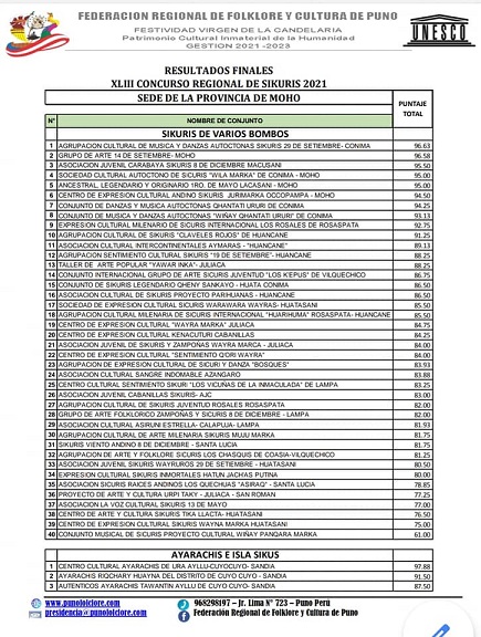02 Auténticos Ayarachis Tawantin Ayllu de Cuyo Cuyo - Sandia 85,60 CONJUNTOS CLASIFICADOS PARA LA OCTAVA DE LA FESTIVIDAD EN HONOR A LA SANTÍSIMA VIRGEN MARÍA DE LA CANDELARIA
