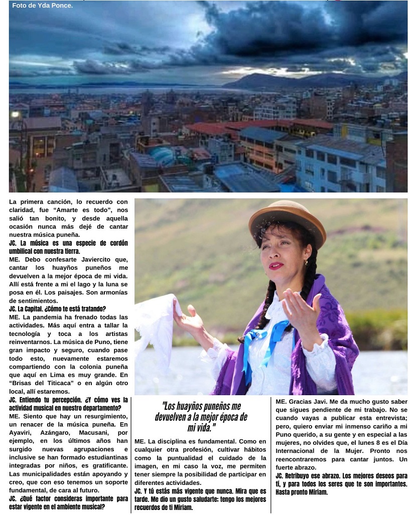 también existen en este volumen boleros, sayas, tinkus. Admira a Lena Fabian interprete Belga, voz que le agrada, también admira a Zulma Yugar, a Lucia de la Cruz, a Picaflor de los Andes. Entre todo felicita y admira a los niños y jóvenes de nuestra región que ya inician con la música ya sea cantando o ejecutando violines, mandolinas guitarras, acordeones, y asi estos niños conforman ya diversos grupos musicales cultivando mas que todo la música puneña, hecho que no sucede en otro departamentos del Perú, así mismo felicita a todos ellos por su esfuerzo.
