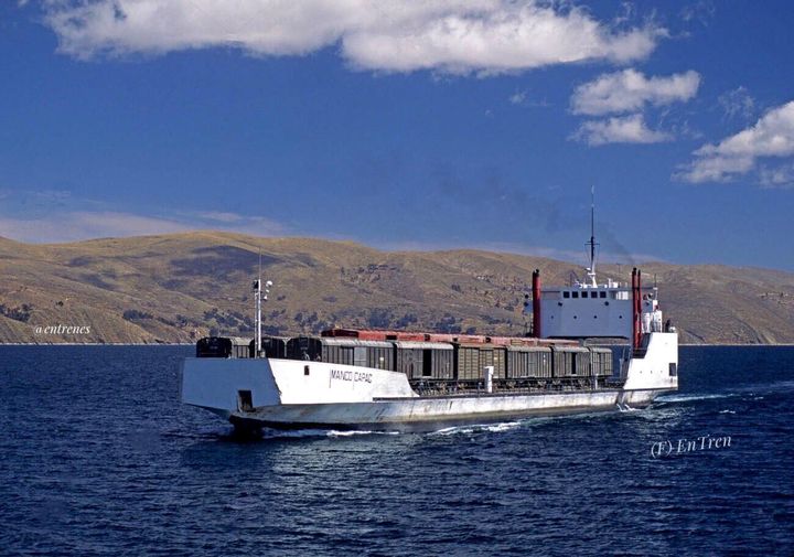 El barco transbordador “Manco Capac” navegando en el lago Titicaca. Este barco fue construido por la empresa canadiense Halifax Shipyard Division en 1970 y rearmado en el astillero de Huajje - Puno. Fue lanzado al lago Titicaca el 30 de agosto de 1971, aún bajo la administración de la empresa de ferrocarriles Peruvian Corporation Limited. En su cubierta tiene rieles, que le permiten transportar vagones cargados. Permitía llevar 18 vagones de 50 tn desde Puno a Guaqui en Bolivia y así evitar los transbordos en Puno muelle desde el tren hacia los antiguos vapores Yavari, Yapura, Inca, Ollanta, Coya. Este barco prestó servicio desde 1971 hasta mediados o finales de la década de los 80s ( O inicios de 90s) ya que con la construcción de la carretera Puno - Desaguadero, se prescindió de este magnífico barco.