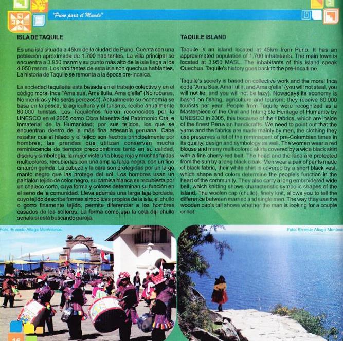 La islaTaquile se ubica en el lago Titicaca, a 3 906 metros sobre el nivel del mar. A pesar de su clima frío, el ambiente cálido de los habitantes del lugar la ha convertido en un destino turístico importante. Adicionalmente, Taquile es ahora conocida porque su arte textil ha sido proclamado obra maestra de la humanidad. En el transcurso de los años, los 1600 comuneros que viven en la isla se han preocupado por preservar las tradiciones y costumbres incaicas, sobre todo en lo que se refiere a la elaboración de telares e indumentarias, las mismas que mantienen |